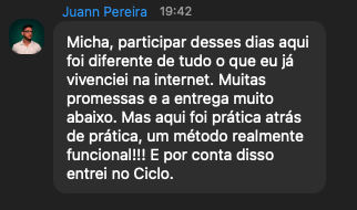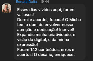 Micha está no mercado digital desde 2016. Foi responsável por desenvolver a estratégia de conteúdo e vendas online de grandes perfis como Mamãe Sarada, Lana Pessoa, Gkay, Desinchá e também do seu próprio perfil. Com mais de 49 mil alunos espalhados por 50 países, Micha defende a nova estratégia de crescimento de perfil usando o estilo Lo-fi. Que é o conteúdo leve e autêntico, queridinho do algoritmo. O objetivo do Micha não é te ensinar a viralizar a todo custo, mas te ajudar a crescer o seu perfil de forma consciente e acelerada, atraindo os seguidores certos para o seu perfil.